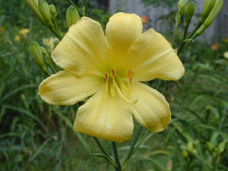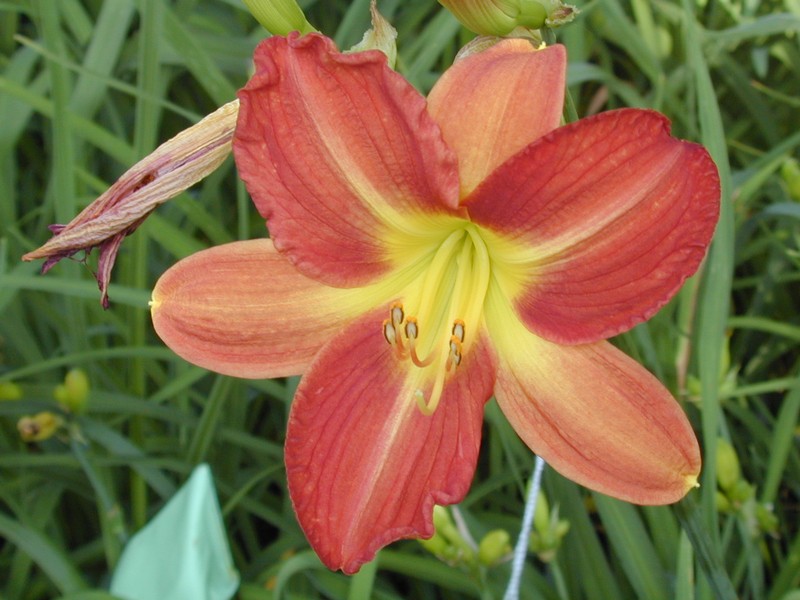 What's that red Amaryllis doing in the daylily bed? In mid-June? Begin With A Bang is the first good red in Mike's garden, and begins the growing season with some of the earliest dormant foliage to emerge. Beautiful gray-green bullets of foliage that scoffs at late spring frosts. The foliage is erect, disease resistant, and stays beautiful until autumn frost. Mike always wanted to introduce this one, but it increased very slowly in his garden. When he finally put some into a good location at Harmon Hill Farm, it increased very nicely. Begin With A Bang has got some terrific qualities: it's a true EE, beginning a week before Stella De Oro. Its size and color are much better than any other red at its season. Don't you hate those brick colored reds? Begin With A Bang is a light red over a very pale yellow base. Both parents contributed to the color clarity. Where did the red come from? Well, Ruffled Ivory has a faint red overlay that Mike didn't notice until this kid alerted him. It's diamond dusted, sun fast and has a yellow-green throat. It always opens well in cool weather, and looks great in a clump. 12 buds per scape, yet it blooms well into midseason. If you'd like to breed for modern-looking EE reds, this is where Mike suggest you begin. He attributes many of the good qualities to its species parent, H. lilioasphodelus: the earliness, great foliage, good opening, and frost hardiness. Or if you're one of us who can't wait to get those first daylilies of the season, this one is for you. $15 |
