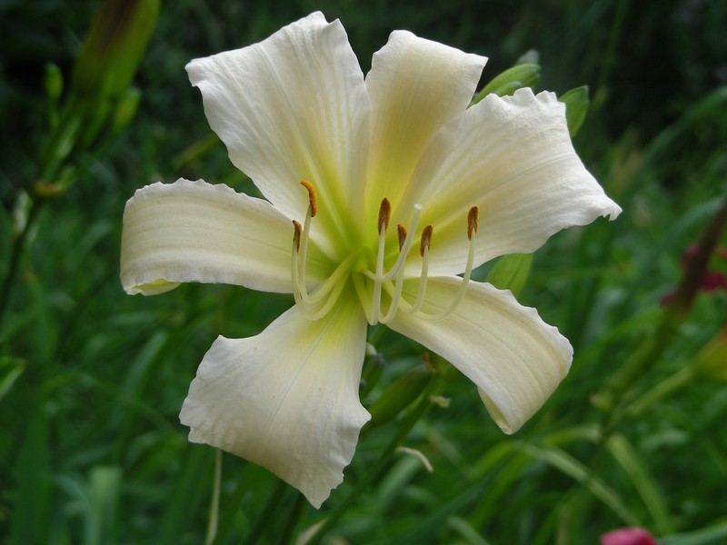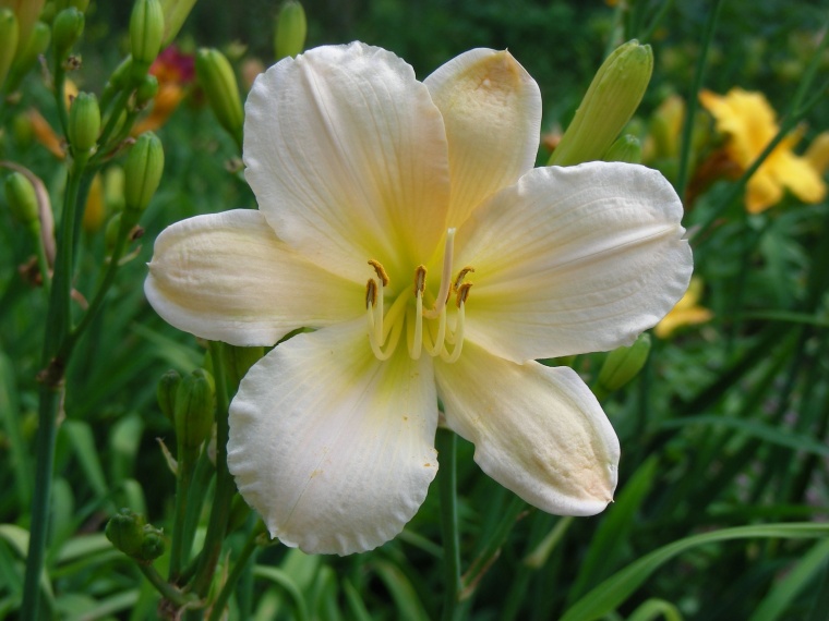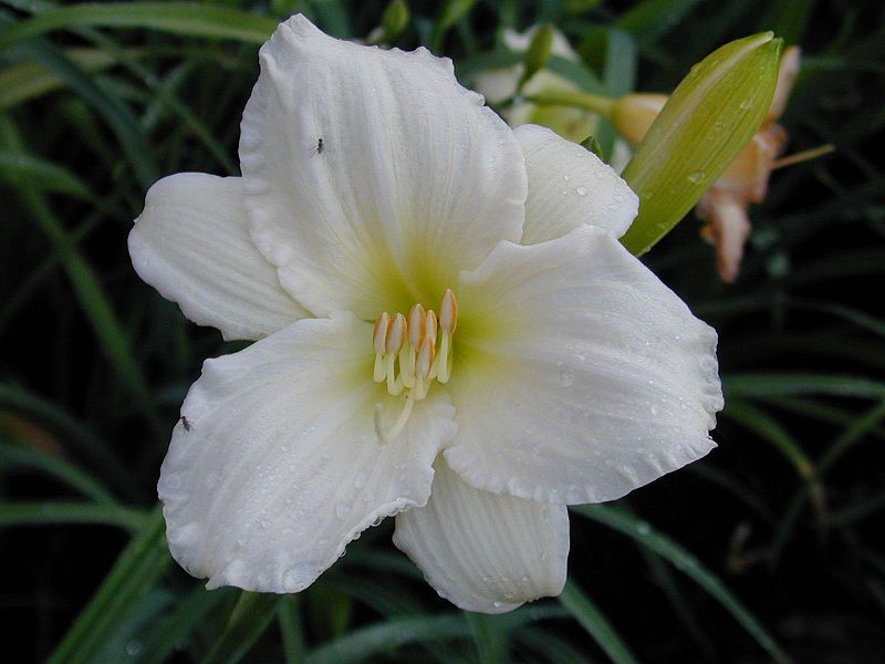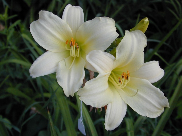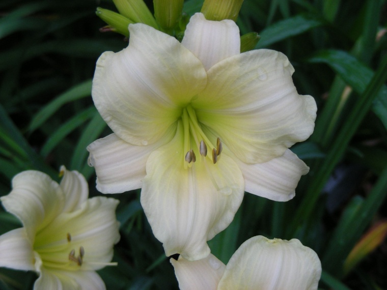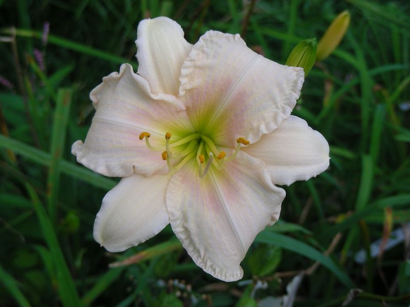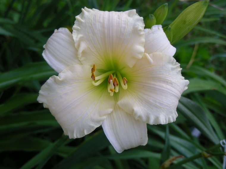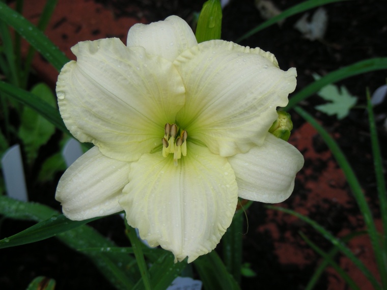 PAEAN FOR JOCELYN (2013) 48" E 4" DOR DIP Near white self. (Sobek 88.40A * Ice Trumpets) One of Mike's first really good tall and small near-whites. Paean For Jocelyn has excellent branching and budcount that it inherited from both parents combined with species-like graceful scapes. It is named in memory of Jocelyn Spragg, a dear friend and stalwart of the New England Daylily Society. Tall whites like this stand out in the garden even if their flowers are small. If you will pardon the pun, it is a high achievement. $20 |