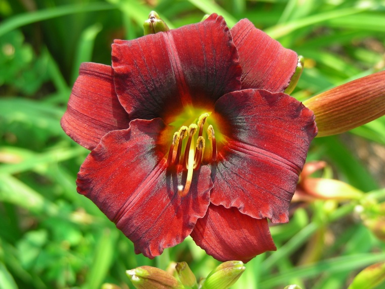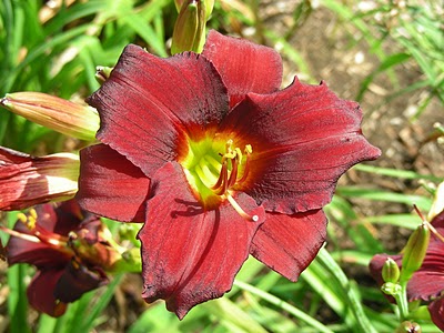 O POSITIVE (2013) 46" EM 3.25" DOR DIP Red with dark band. (Crazy Kids * Indelible Blood) Vigorous, tall, sunfast, well branched and budded and beautiful. The instant Bob Sobek saw it, he said he wanted it: and not too surprisingly, it is out of one of his introductions. With 6 branches and 24 buds with excellent foliage, it puts on a terrific display for a long time. O Positive has a ruffled bagel form or perhaps you could say it resembles a red blood cell (but it's too big to be named Erythrocyte.) $35 |