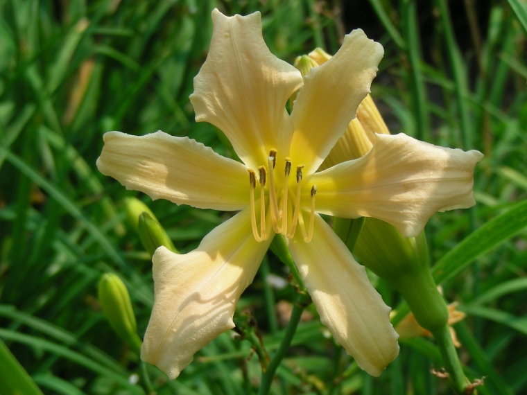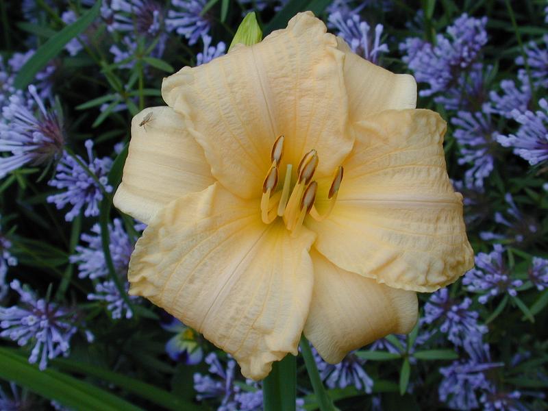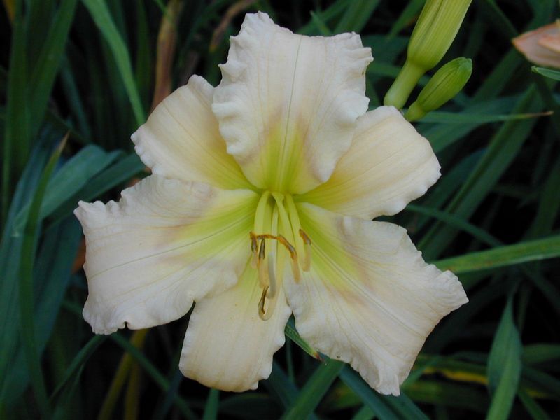 The longest-blooming daylily in Mike's garden. Four years running it has bloomed for 11 weeks on three sets of scapes. The color is a very cool yellow-green that fades in the sun to a remarkable cream and green giving the impression of a cream flower with a green bullseye. There is no other northern rebloomer on the market with this color. It has an excellent budcount of 20 (unusually high for a rebloomer.) The heavily ruffled petals twist differently in every flower, providing lots of motion in this unusual form. This one sells in August and September when people see the rebloom. $15 |