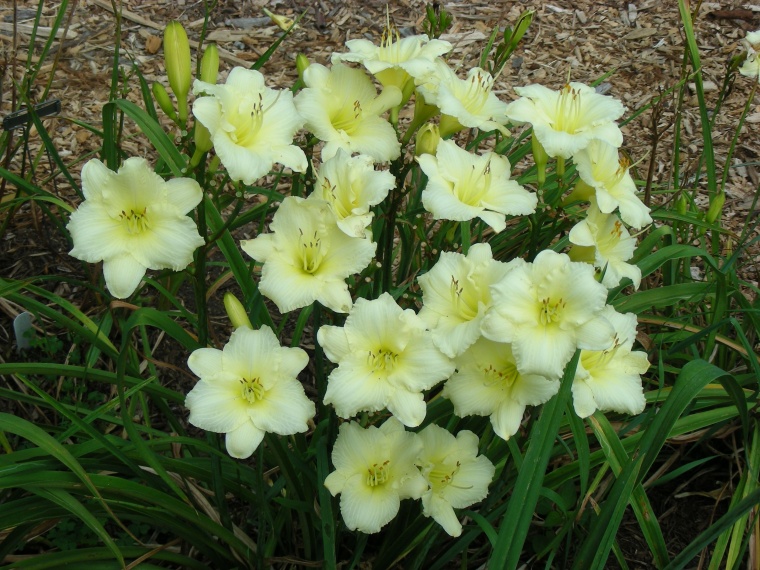BRILLIANT BOUQUET (2013) 28" EM 3.5" DOR DIP Cream self. (Sunshine On Clouds * MH0207K) With good behavior and foliage like Sunshine on Clouds, Brilliant Bouquet covers itself in bloom, at times giving a "cushion mum" effect. The photo is ungroomed except for liveheading the previous day, and it is unnecessary to remove the spent blooms because they close well. With 5 branches, 28 buds, some bud building and some rebloom, that means a long season covered with flowers. $15 |