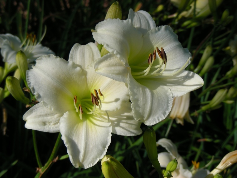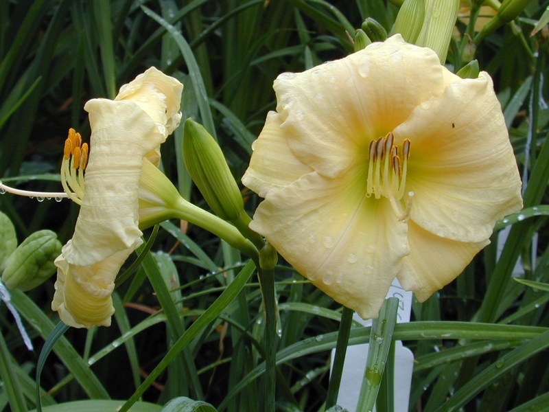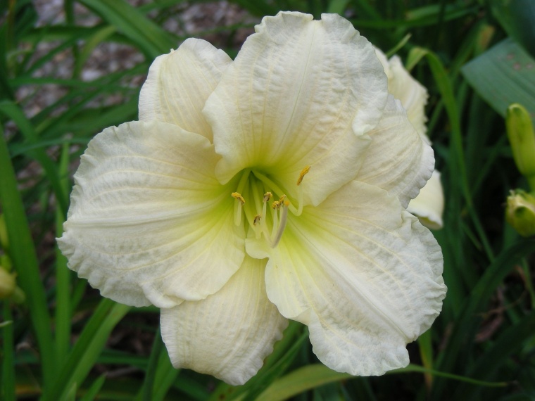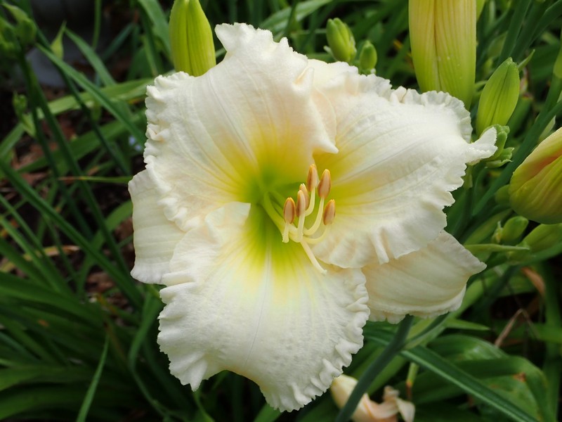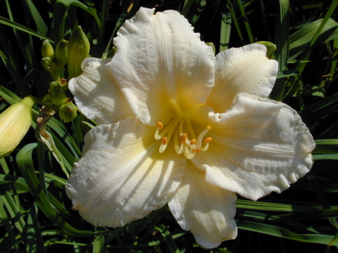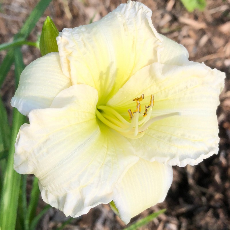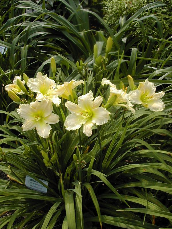 NORTH MEETS SOUTH (2020) 26" EM Re 4" DOR DIP Ext NearWhite Self MH1406D = (Accentuate The Green * Evelyn Gates) This is as close as I have come to my original goal of Stella De Oro rebloom with a ruffled white flower like Monica Marie. And it is excitingly close! About half the fans rebloomed last year: more rebloom should be expected in the south. A very near-white bagel with beautiful ruffling. It opens well in cool weather, and very importantly it also closes well so that it doesn't need deadheading. 4 branches and 17 buds. The foliage and clump look really good until it goes dormant, darker green than most near-whites. Anybody wishing to breed for beautiful northern rebloomers should use this for its size, clarity, ruffles, rebloom, good increase, foliage and clump. I'd recommend crossing it to anything in my rebloom lines. Pod and pollen fertile. And it goes without saying that I recommend this as an extraordinary garden plant. $50 |