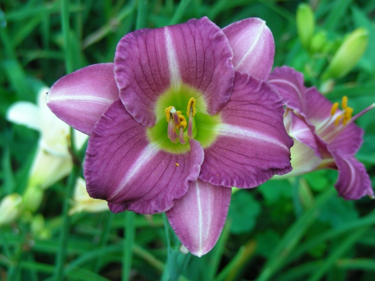 SIOUX HALL (2016) 36" EM 3.5" DOR DIP Violet purple with white midribs MH0853R = (Sobek 93.36 * Gladycita) This is a very intense and sunfast lavender with an extraordinary green throat that speaks for itself. It is named in honor of the late, great Sioux Hall (6th dan Aikido), who taught me so much about Aikido and raising children. I knew Sioux for 32 years, and she has been a close friend of my entire family. Sioux usually tied her red hair with a lavender ribbon. I'm registering this daylily with 5 branches and 33 buds, but sometimes it has 6 branches and 37 buds (and sometimes less.) The excellent scape, which is erect and doesn't lean at all, comes from Altissima breeding by Bob Sobek. $30 |