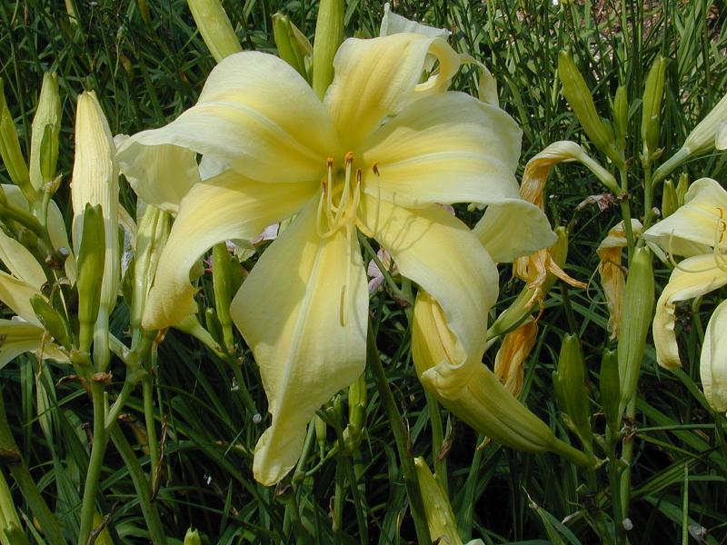 Mike had no intention of introducing this seedling: it wasn't white, it only rebloomed a bit, it didn't increase as fast as his other rebloomers, it was a reluctant pod parent. But Bob Sobek proclaimed it the outstanding clump in Mike's garden for the brilliance, unique shade, and floriferousness. It is a brilliant light yellow, in the cream range but with none of the dullness of most creams. Mike attributes that to the extreme diamond dusting. The upfacing blooms have a yellowgreen throat. Crossed with EARLY AND OFTEN, it is the parent of his first nearwhite rebloomer, and the grandparent of his latest crop of nearwhite rebloomers. It has 18 buds on three branches. In Mike's garden, Sunshine On Clouds reblooms lightly, but in other people's gardens, it is a much stronger rebloomer. $15 |