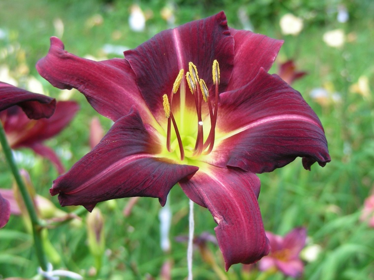 WAY UP THERE (2015) 60" M 4.25" DOR DIP EXT Burgundy with White Midrib MH0874M = (Arterial Blood * Pit Of Despair) Five feet tall! A very clear burgundy with a white midrib, black veins and a green throat. 5 well-spaced branches, 20 buds and bolt erect scapes that do not fall. $30 |