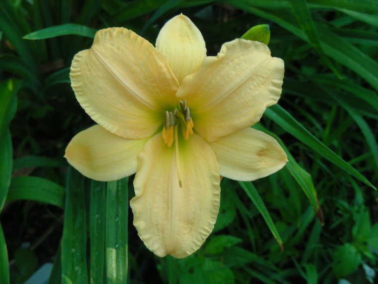 COMMENCE (2016) 21" EE 4" DOR DIP Melon Polychrome MH1026.25 = (Ain't Yeller * Chill) Mike's very best extra early to date. A very pale melon with a green throat that opened the first of June! 4 branches and 24 buds. Extra earlies need to open well in cool weather, and this one was flat open well before 7AM after a 55 degree night (I didn't get to check with cooler temperatures.) It has excellent substance and is rainfast, though it is not entirely sunfast. I love the wide, ruffled petals and cool melon color. There is nothing else like it during the extra early season. Vigorous, too! If you want to have a beautiful daylily that blooms with the June perennials but isn't yellow, this is the one. If you want to breed for early bloom to facilitate rebloom or to cope with short growing seasons, I highly recommend this one. $20 |