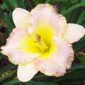 Derrow 13 - 18" EM 3" DOR DIP Lt shell pink w/round royal purple eye and picotee edge, flat round blooms | |
