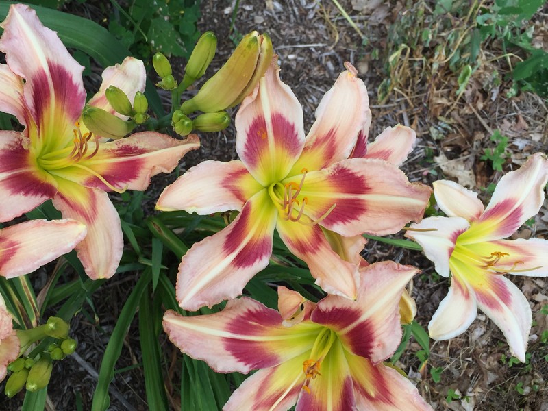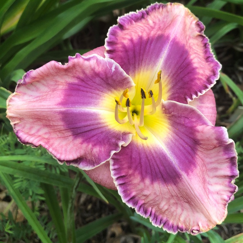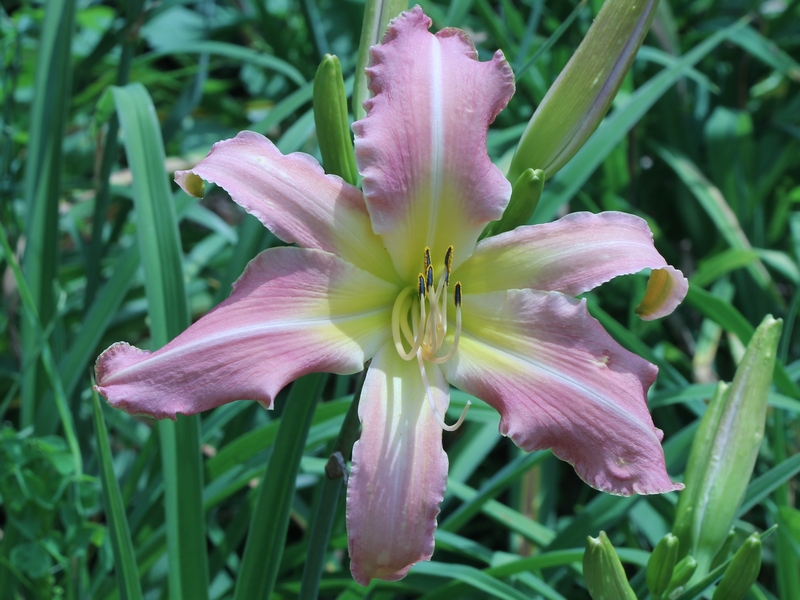 Mason 12 - 52" EM 7" SEV TET Rose pink w/pale grape eye, sepals quill & curl, petals often pinch UF Crispate |