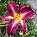 Emmerich 20 - 40" EM 8" SEV TET Very dark cranberry grape, can also be cranberry merlot or dark cranberry or merlot depending on the weather, one third midribs, white edge, green throat, and pinched petals UF, Crispate, Vfra |